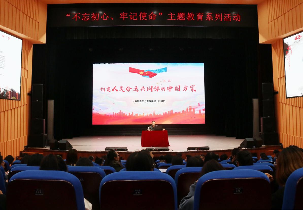 10月16日下午,学院公共教学部(思政课部)彭朝阳教授在实验剧场带来了“构建人类命运共同体的中国方案”的主题讲座,公共教学部主任王含光、副主任李莉、政史教研室主任谭志斌以及400名师生聆听了讲座。