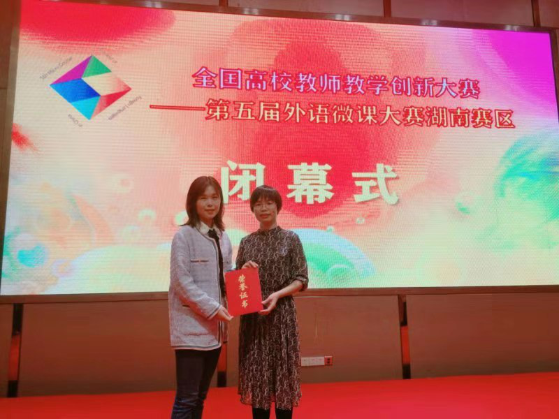 在2019年10月12至14日举行的全国高校教师教学创新大赛暨第五届外语微课大赛湖南省赛中,我院英语教研室杨蕊、张晓芳老师团队凭借作品《中西方隐私》在现场微课说课竞赛中表现优异,经前期网络评审和现场评委打分,最终喜获二等奖。