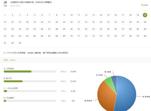 同时,心理课还通过问卷调查了解了疫情期间学生心理健康状况。根据收集到的3888份数据显示99%的同学身体健康状态良好;90%以上同学睡眠、饮食状态良好;约70%的同学心理状态没有受到明显的负面影响,约20%的同学在疫情期间有一定的应激反应但并不严重,还有不到10%的同学心理状态偏差,其中有2%的同学相对严重。