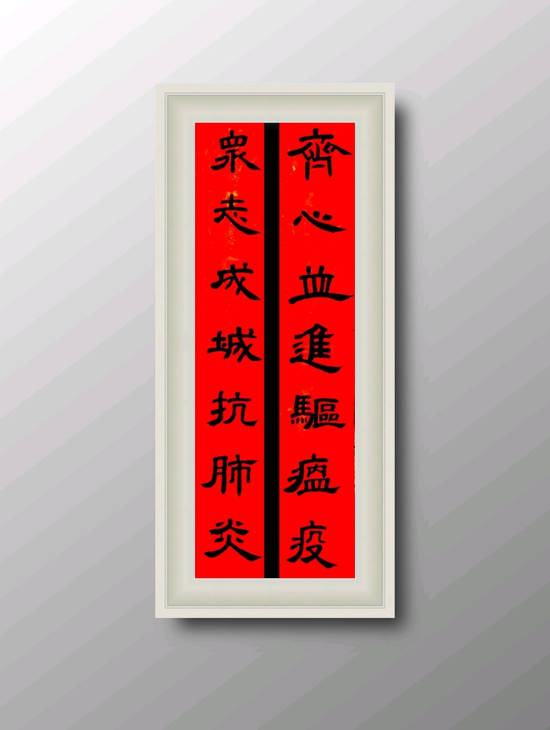 齐心并进驱瘟疫,众志成城抗肺炎。庚子新年,瘟疫大肆我国传染。全国上下人心惶惶。但是中国人民不惧困难,迎难而上,举全国之力,支援湖北武汉等地。疫情看出中国人民在灾难面前的齐心协力,团结友爱。我相信战胜疫情指日可待!中国加油!本次作品我采用中国传统春联纸,字体采用隶书。红色的春联纸表现出中国红色传统!表达一定中国一定战胜疫情!隶书字体上下扁平,表达疫情可以被压制!字体左右舒展,表达中国各个地方战胜疫情后取消封城,平和发展,欣欣向荣之意!