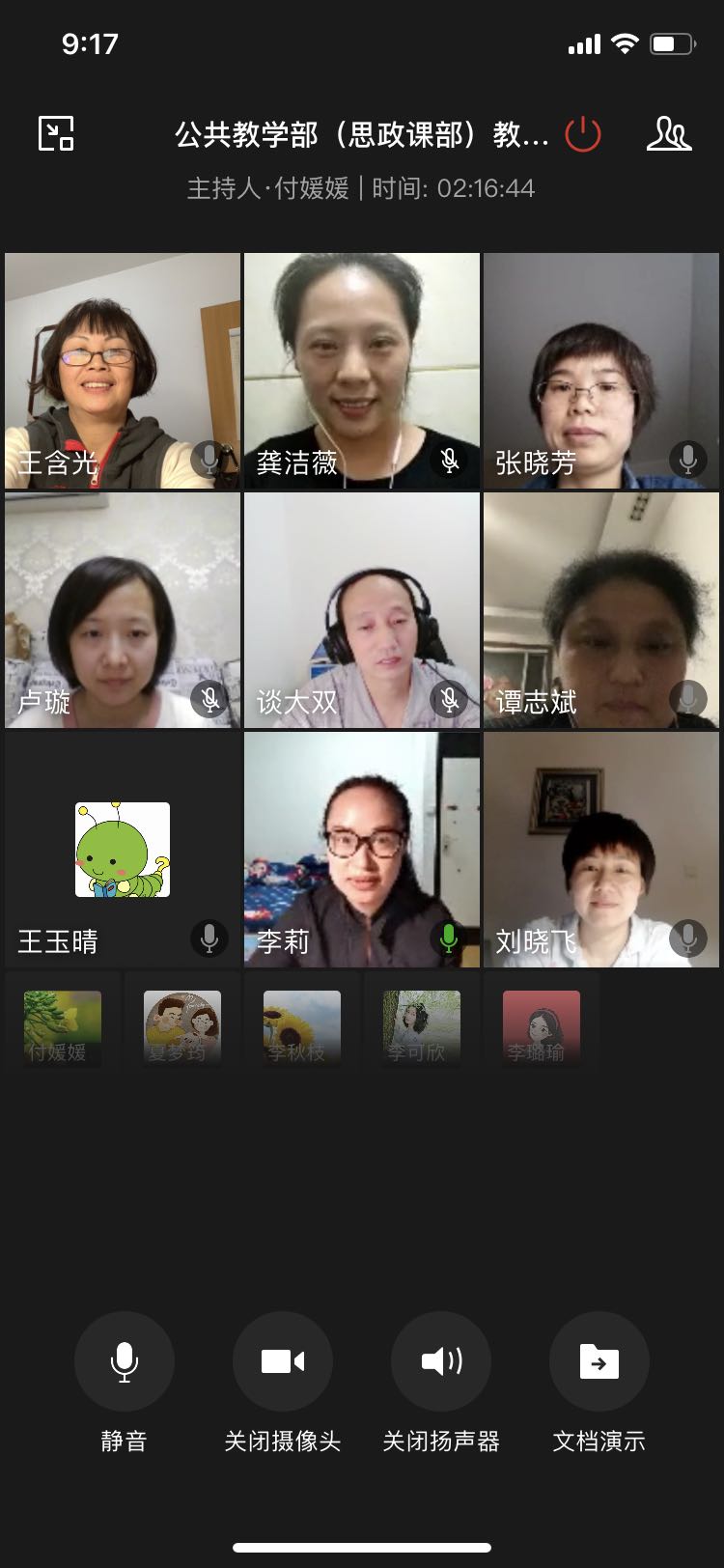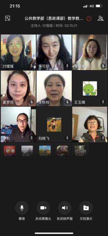 4月17日晚19:00,公共教学部(思政课部)在企业微信上通过视频会议的形式召开了本学期第五次教学例会,公共教学部(思政课部)全体行政人员及各教研室主任、副主任参加了会议,会议由主任助理付媛媛主持。