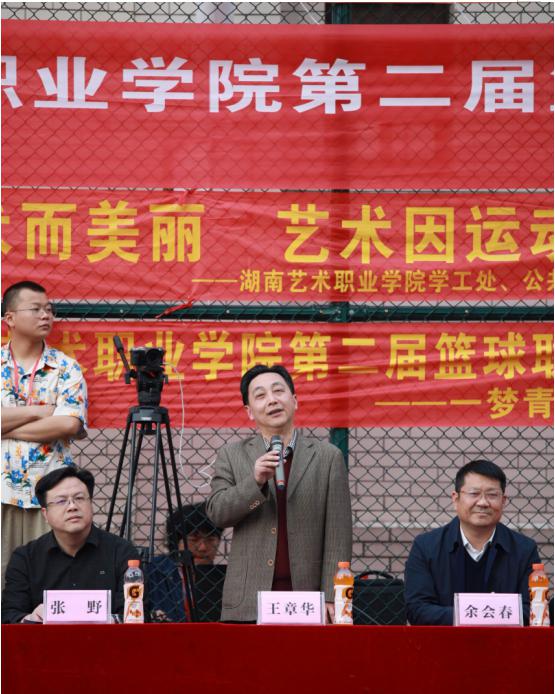 王章华书记为本次篮球联赛致开幕词。首先他对为本次篮球联赛顺利进行表示热烈的祝贺,对运动员、裁判员以及全体工作人员致以诚挚的问候。他指出,所有球员应比赛中发扬更高、更快、更强的体育精神,顽强拼搏,奋力争先,以高昂的斗志,高超的球艺,赛出友谊,赛出风格,赛出水平;全体裁判员要忠于职守,公正裁决,努力营造公平、有序的良好竞赛环境。希望通过本次篮球联赛,能体现出湖艺学子良好的精神风貌,达到增强体质、陶冶情操、促进团结的效果。同时,他也对学院今后的体育工作提出四点要求,一是要定期举办学院运动会;二是要积极开展单项比赛;三是要打造一支高水平运动员队伍;四是要鼓励全院师生坚持每天运动1小时。