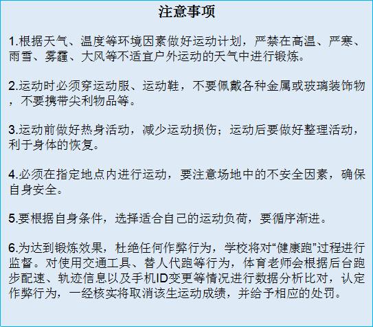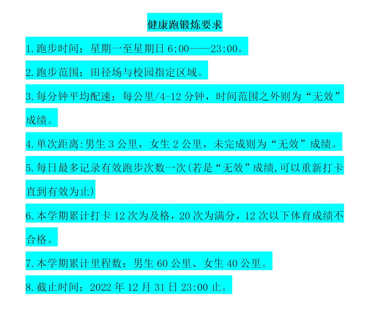 体育部对课外锻炼的平均配速、最少距离、最长距离、最少有效次数等均作了明确要求,从这些要求中可以清晰的感受到,学校希望学生在体育锻炼中享受乐趣、增强体质、健全人格、锤炼意志,养成体育锻炼的习惯,而不仅仅是为了体育达标。