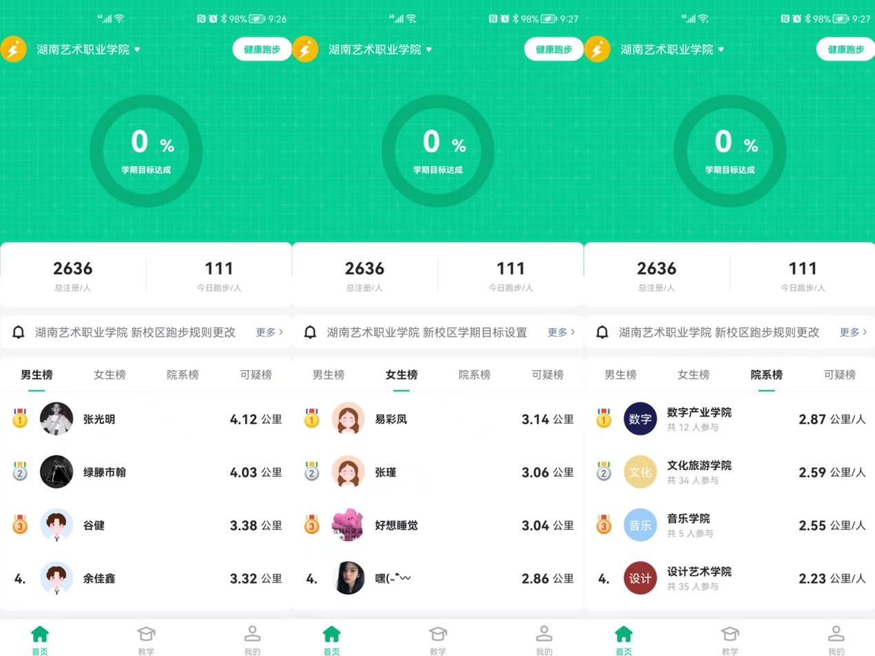 健康跑活动开展以来,跑步成了艺苑校园的一道美丽风景线,校园操场上到处活跃着同学们朝气蓬勃的跑步身影。从“小步点”后台数据可以看到,注册并参与健康跑学生人数达到2636人,平均每天有111人参加健康跑,其中10月26日有878人参加跑步活动,10月28日不完全统计男生榜冠军为4.12公里,女生榜冠军3.14公里,院系冠军榜为数字产业学院,同学们用脚步丈量校园,用奔跑践行初心,在奔跑中展现湖艺学子的风采!