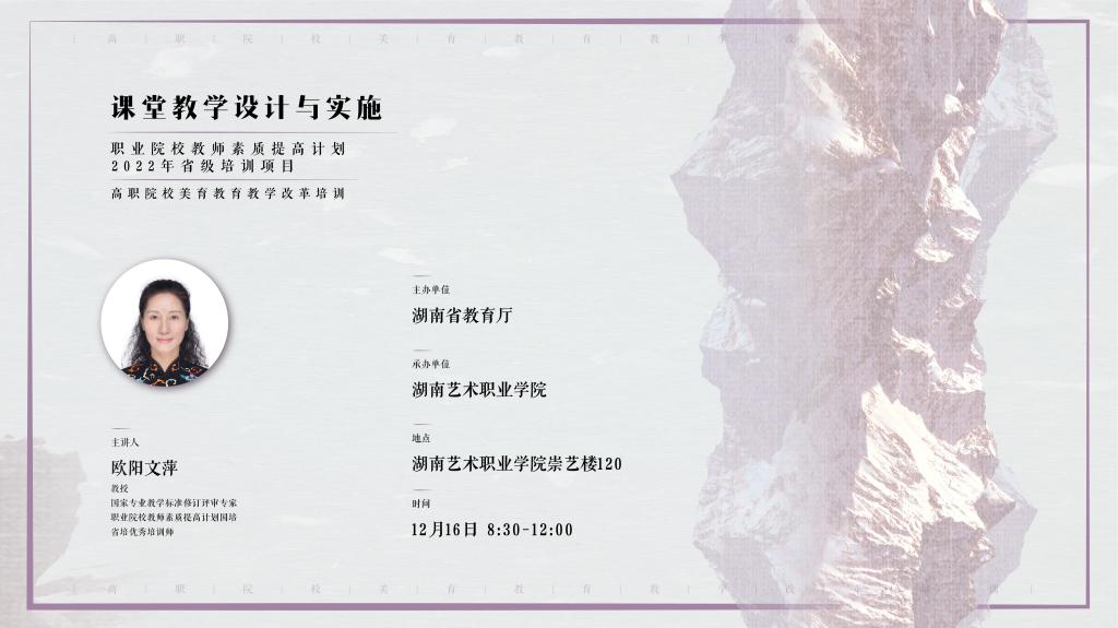 12月16日上午,公共教学部(体育部)特邀国家专业教学标准修订评审专家、职业院校技能竞赛教师教学能力比赛国赛评委欧阳文萍教授在崇艺楼120报告厅为2022年高职院校美育教育教学改革培训班的全体学员带来了“课堂教学设计与实施”专题讲座。